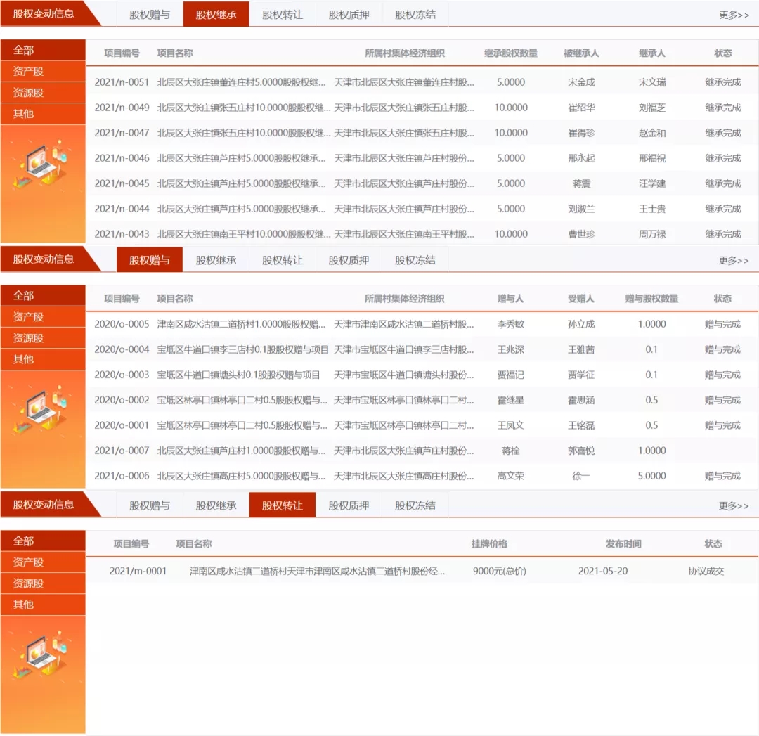 近期,由神州信息打造的天津农村产权交易平台成功为津南区咸水沽镇二道桥村股份经济合作社成员办理了股权转让变更手续,标志着全国首笔村集体经济组织股权转让项目交易完成。至此,天津市村集体经济组织股权托管交易平台已实现股权继承、股权赠与、股权转让三大股权变更业务全覆盖。其中股权继承56笔,总价值454556.66元,股权赠与13笔,总价值13600.68元,股权转让1笔,总价值9000元。
