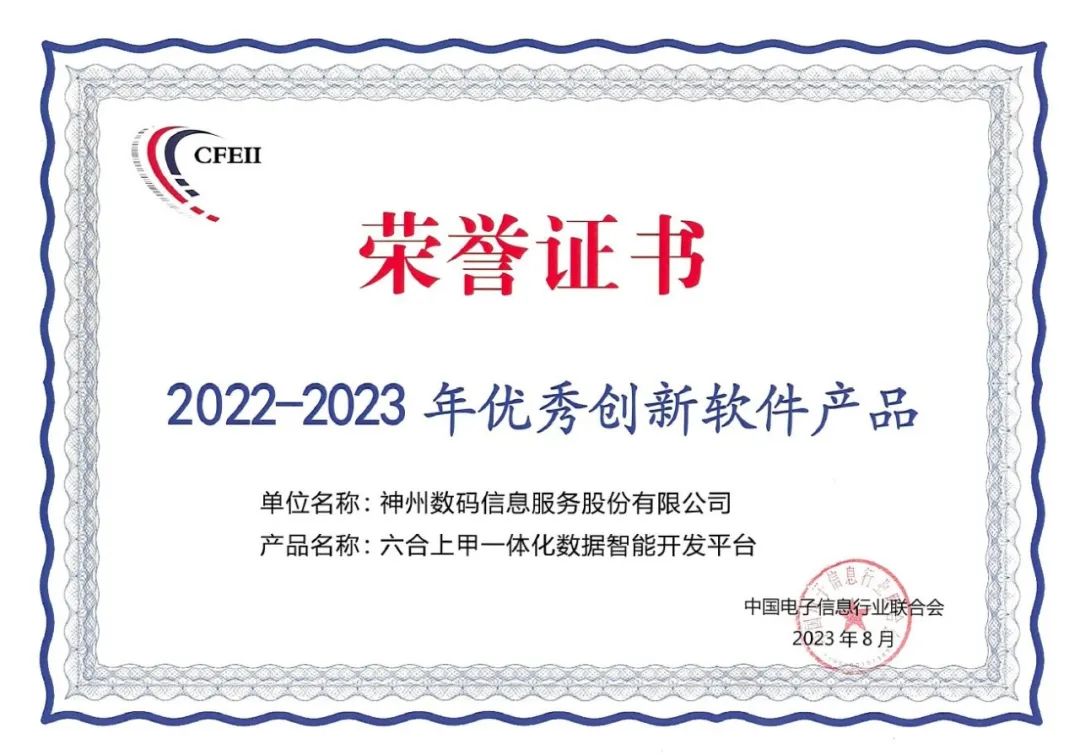 此外,神州信息推出的“六合上甲一体化数据智能开发平台”还荣获中国电子信息行业联合会颁发的“2022-2023年优秀创新软件产品”荣誉证书。